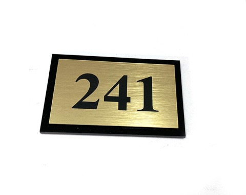 Tabliczka wykonana jest z laminatu grubości 1,6 mm w kolorze złoto szczotkowane oraz czarnej plexi o wysokim połysku grubości 3 mm.