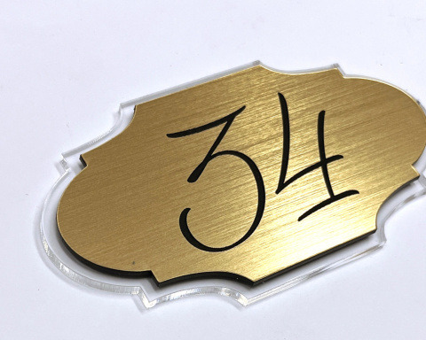Tabliczka wykonana jest z laminatu grubości 1,6 mm w kolorze złoto szczotkowane oraz transparentnej plexi o wysokim połysku grubości 3 mm.