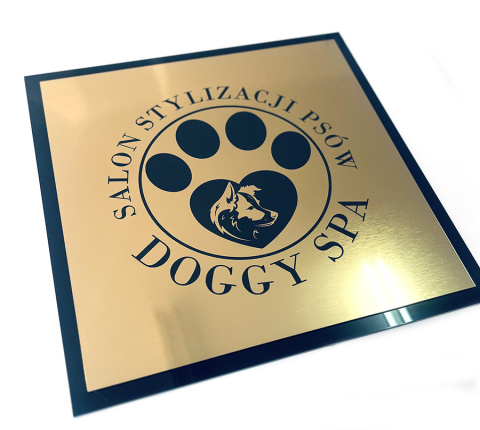 Tabliczka wykonana jest  z laminatu grubości 1,6 mm w kolorze złoto  szczotkowane z filtrem uv  oraz czarnej  plexi o wysokim połysku  grubości 3 mm.