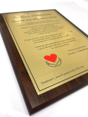 Pamiątkowa tabliczka grawerowana na podkładzie drewnianym.