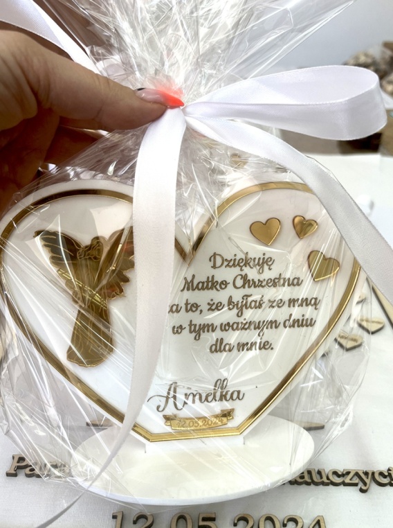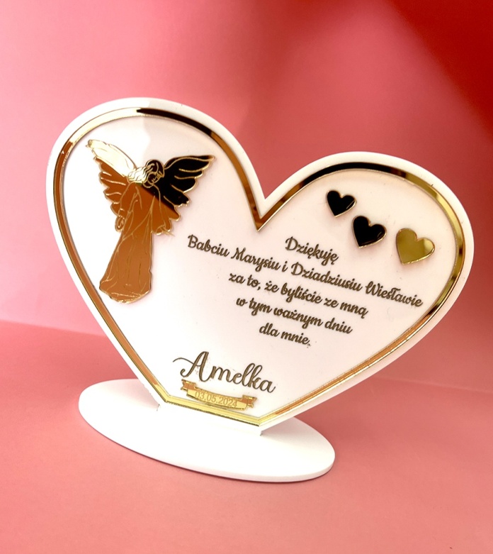 Elegancka statuetka w kształcie serca z aniołem i złotymi detalami to wyjątkowy sposób na podziękowanie bliskim za obecność w ważnym dniu dziecka – Komunii Świętej, Chrztu czy roczku. Delikatny design, personalizowany tekst oraz imię i data tworzą piękną, pamiątkową dekorację na lata.