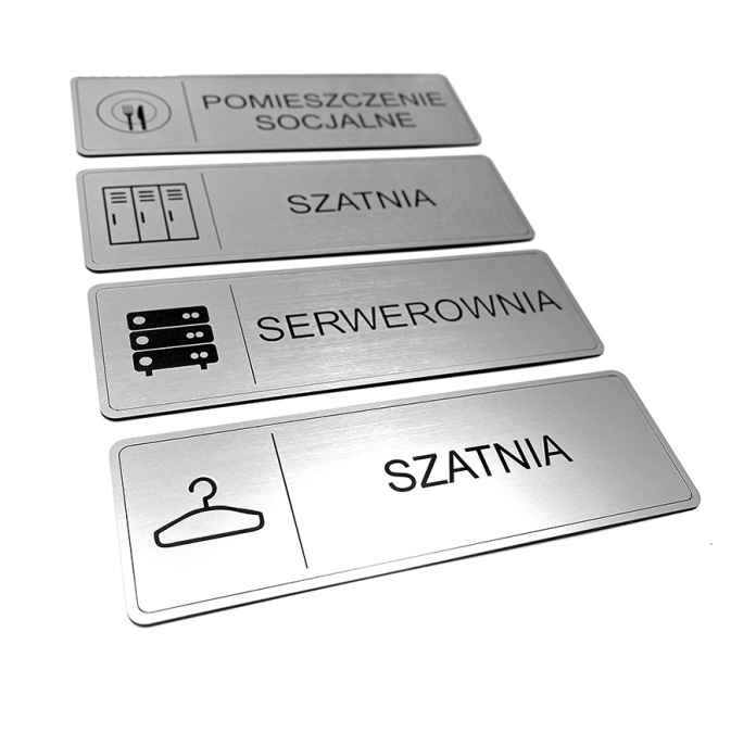 Tabliczka wykonana jest z laminatu grubości 1,6 mm w kolorze srebro szczotkowane.